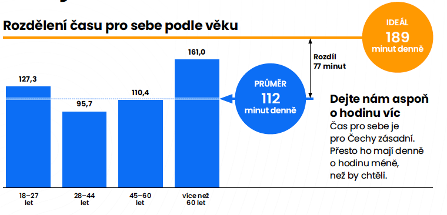 V průměru mají lidé pro sebe 112 minut denně, zatímco střední generace ve věku 28 až 44 let pouze 96 minut. Ideálně by ale chtěli mít téměř tři hodiny, v průměru jim denně chybí 77 minut, což představuje přibližně 470 hodin ročně. Průzkum ukazuje rozdíly mezi generacemi. Největší rozdíl mezi představou a realitou zažívají lidé ve věku 28 až 44 let – tedy pracující rodiče, kteří kombinují práci, rodinu a péči o domácnost. Právě oni jsou s množstvím času pro sebe nejméně spokojeni.