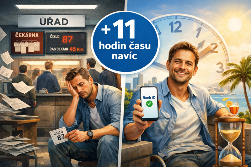 Lidé tráví na úřadech v průměru 20 hodin ročně, největší zátěží přitom nejsou samotné formuláře, ale cestování, čekání a nejistota ohledně vyřízení. Bankovní identita ušetří až 16 hodin ročně.