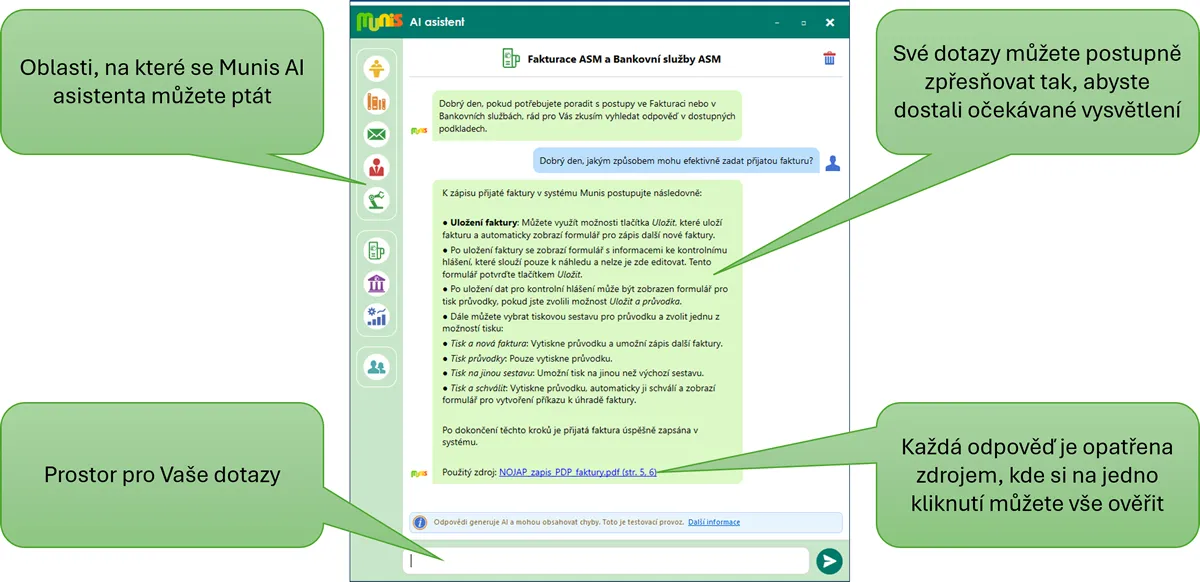 V ověřovacím provozu je Munis AI asistent nasazený v modulech Fakturace ASM a Bankovní služby ASM, elektronické spisové službě Munis ERMS a v modulu Seznam obyvatel a volby. Tedy v modulech, které se v poslední době dynamicky rozvíjejí a v nichž je celá řada nových procesů, které vám mohou pomoci, pokud o nich budete vědět. A právě Munis AI asistenta se na ně můžete zeptat.